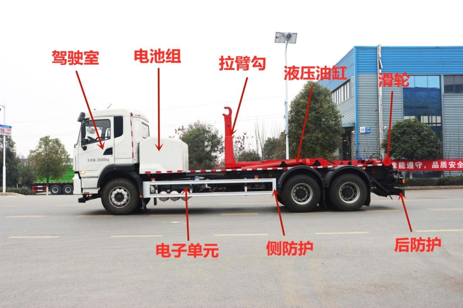 一、底盤配置: 采用東風(fēng)DFH1180BEV1車身,配置玉柴TZ370XS-LKM1103發(fā)動(dòng)機(jī)160馬力,國六排放標(biāo)準(zhǔn),軸距4500,4700(mm),整備質(zhì)量9.5噸,額定載質(zhì)量8.37噸,五擋變速箱,帶動(dòng)力轉(zhuǎn)向,帶原廠空調(diào),ABS 型號(hào):J ABS;ABS 生產(chǎn)企業(yè):焦作博瑞克控制技術(shù)有限公司;儲(chǔ)能裝置單體種類/生產(chǎn)企業(yè): 磷酸鐵鋰蓄電池 /寧德時(shí)代新能源科技股份有限公司;儲(chǔ)能裝置總成的生產(chǎn)企業(yè):寧德時(shí)代新能源科技股份有限公司;驅(qū)動(dòng)電機(jī): TZ370XS-LKM1103,功率(KW):160;側(cè)面防護(hù)裝置材料采用鋁合金,連接方式為螺栓連接,后防護(hù)裝置材料為 Q235 A,連接方式為螺栓連接,后部防護(hù)裝置的斷面尺寸為:60×120(mm),離地面高度 450mm;專用功能及裝置:液壓 缸、拉臂鉤等專用設(shè)備,實(shí)現(xiàn)對(duì)垃圾的該車上黃牌,城區(qū)道路請(qǐng)注意限行標(biāo)識(shí)。